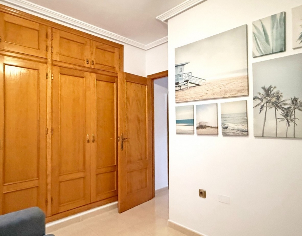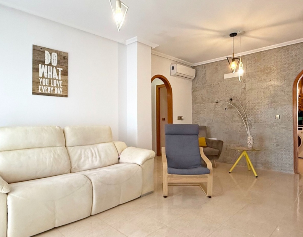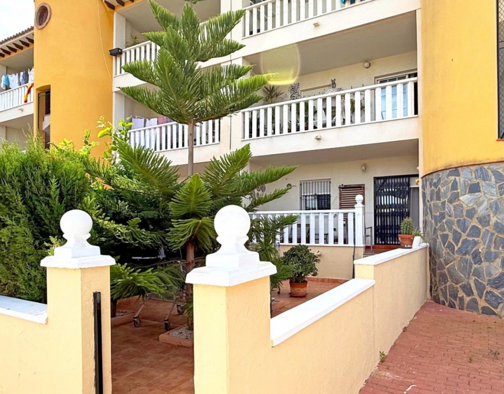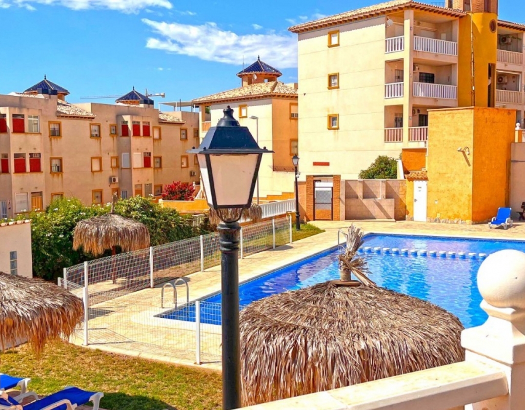 We are delighted to present this charming ground floor apartment located in the sought-after area of Lomas de Cabo Roig, just a short distance from the beaches and golf courses of Orihuela Costa. The property offers 2 bedrooms, 1 bathroom, a well-equipped independent kitchen, and a bright living and dining area. The home stands out for its generous outdoor spaces: a large front terrace with open views of the surrounding nature, perfect for enjoying the Mediterranean climate, and a spacious rear patio ideal for relaxing or entertaining. Situated in good condition and filled with natural light throughout, the apartment provides both comfort and convenience. Residents can also enjoy access to a well-maintained communal pool, making it an excellent choice for holidays, permanent living, or as a rental investment. All essential services—including shops, restaurants, and supermarkets—are within walking distance, ensuring a relaxed and practical lifestyle. Key Features: Ground floor apartment in Lomas de Cabo Roig 2 bedrooms & 1 bathroom Independent, fully equipped kitchen Bright living spaces Large terrace with open nature views Spacious rear patio Communal pool Good condition throughout Walking distance to all services