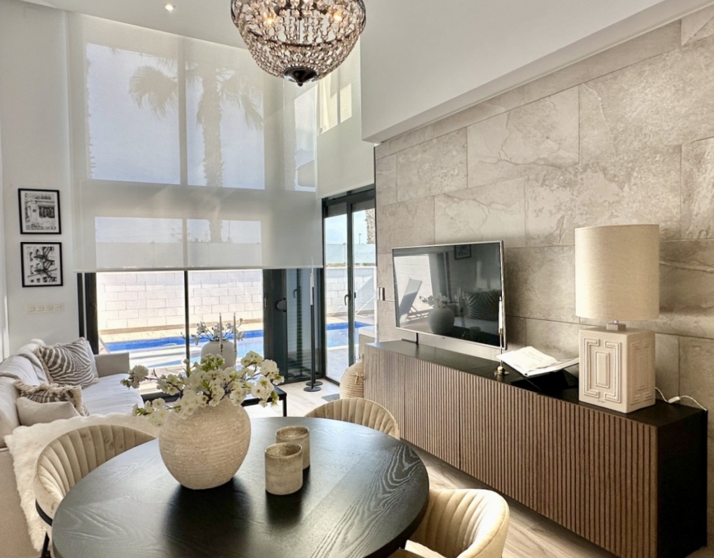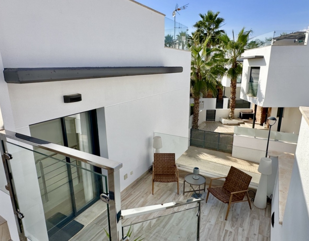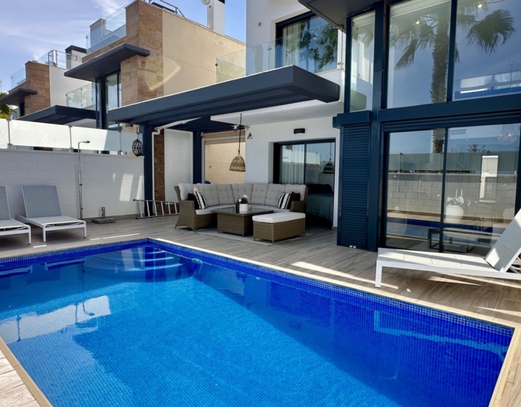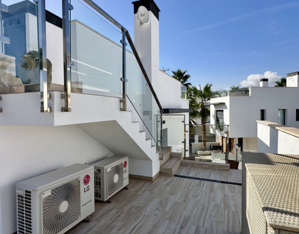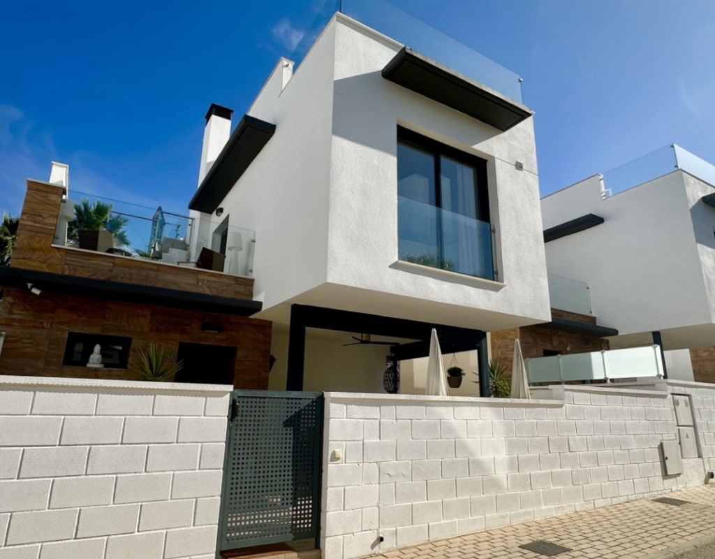 Welcome to your dream home in the heart of Lomas de Cabo Roig, one of Orihuela Costa’s most desirable residential areas. This stylish and well-maintained detached villa is ready to move into, offering a perfect blend of comfort, modern living, and Mediterranean charm. Whether you're looking for a permanent residence, a luxury holiday escape, or a high-return investment, this property delivers on all fronts. Why This Villa Stands Out: Spacious and Bright Interiors The villa spans two levels with 128 m² of living space. It features an open-plan living and dining area, a fully equipped contemporary kitchen, and three large bedrooms, including two with en-suite bathrooms. All bedrooms come with built-in wardrobes and ample natural light. Exceptional Outdoor Living Set on a 189 m² private plot, the home offers a private swimming pool, a large rooftop solarium with open views, and a fully tiled terrace with BBQ, lounge furniture, and dining area — perfect for sunbathing, entertaining guests, or relaxing with family. Optimised Orientation South-east facing front patio and south-west facing terrace and pool area provide all-day sunlight. The property also includes air conditioning and individual heating in every room, ensuring comfort throughout the year. Prime Location Located in a quiet and well-established urbanisation, you are just a short drive from the beaches of Orihuela Costa. Daily conveniences including supermarkets, restaurants, shopping centres, golf courses, and schools are all nearby. Property Summary: 3 bedrooms, 3 bathrooms 128 m² built, 189 m² plot Private pool, rooftop solarium, tiled terrace with BBQ Built in 2018, excellent condition Air conditioning and heating throughout Quiet setting, close to all amenities This villa offers the ideal combination of style, comfort, and location. Whether you want to live here year-round, enjoy it as a holiday home, or rent it as an investment, it’s a smart choice on the Costa Blanca. Book your private viewing today — this opportunity won’t last long.