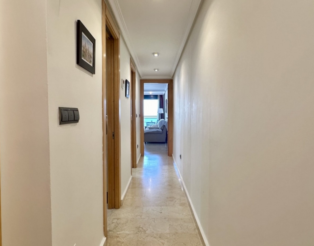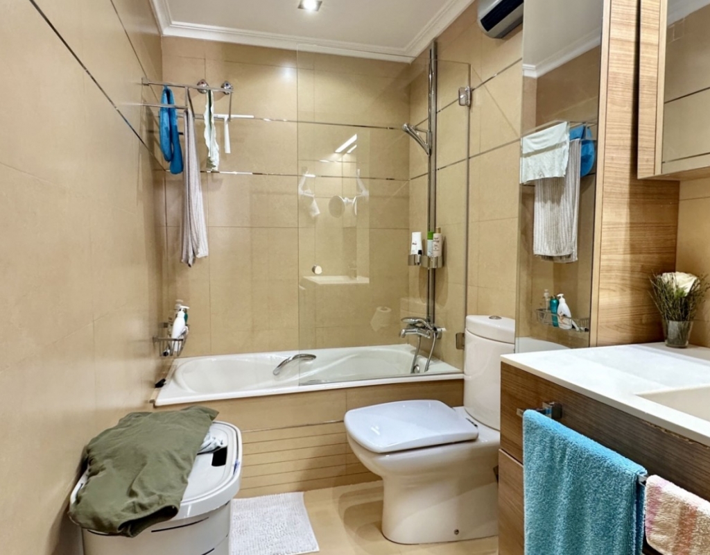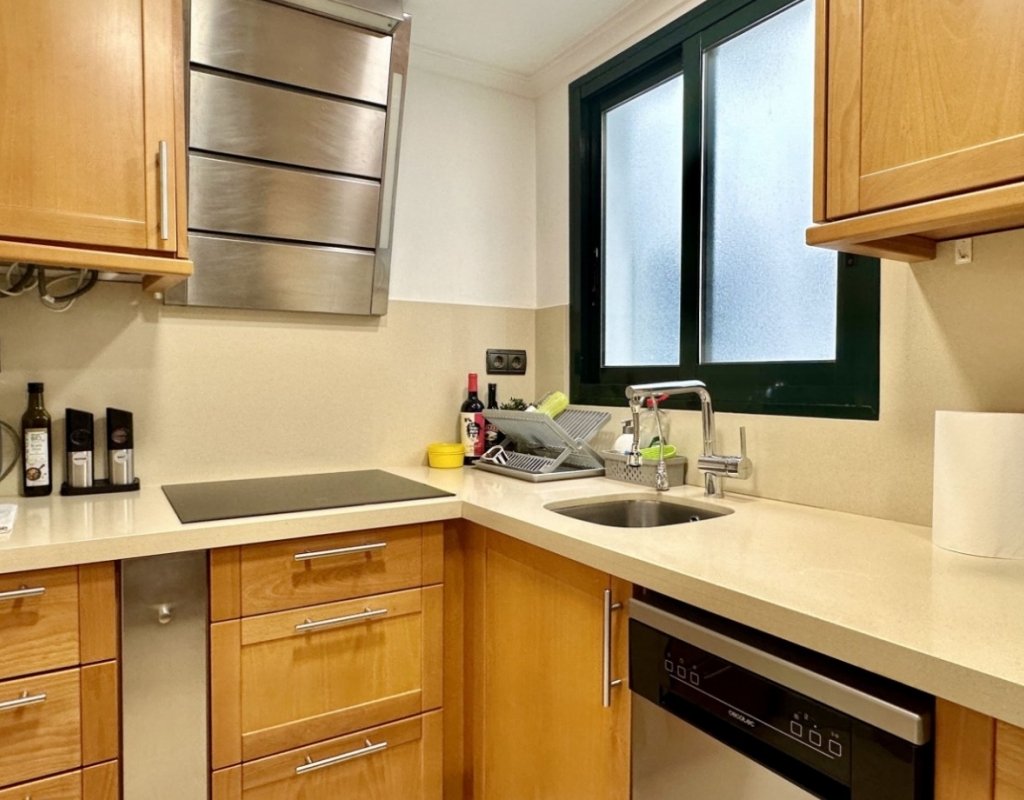 With a total area of 78 m², the property features a spacious living room, a fully equipped modern kitchen with Silestone countertops, induction hob, dishwasher, osmosis water system, flat extractor fan and a large pantry with automatic lighting. The apartment includes two bedrooms and two bathrooms — one of them en-suite with a bathtub. The second bathroom features a hydromassage shower column and thermostatic taps. Sliding doors in the kitchen and bathrooms optimise space and add a sleek touch.