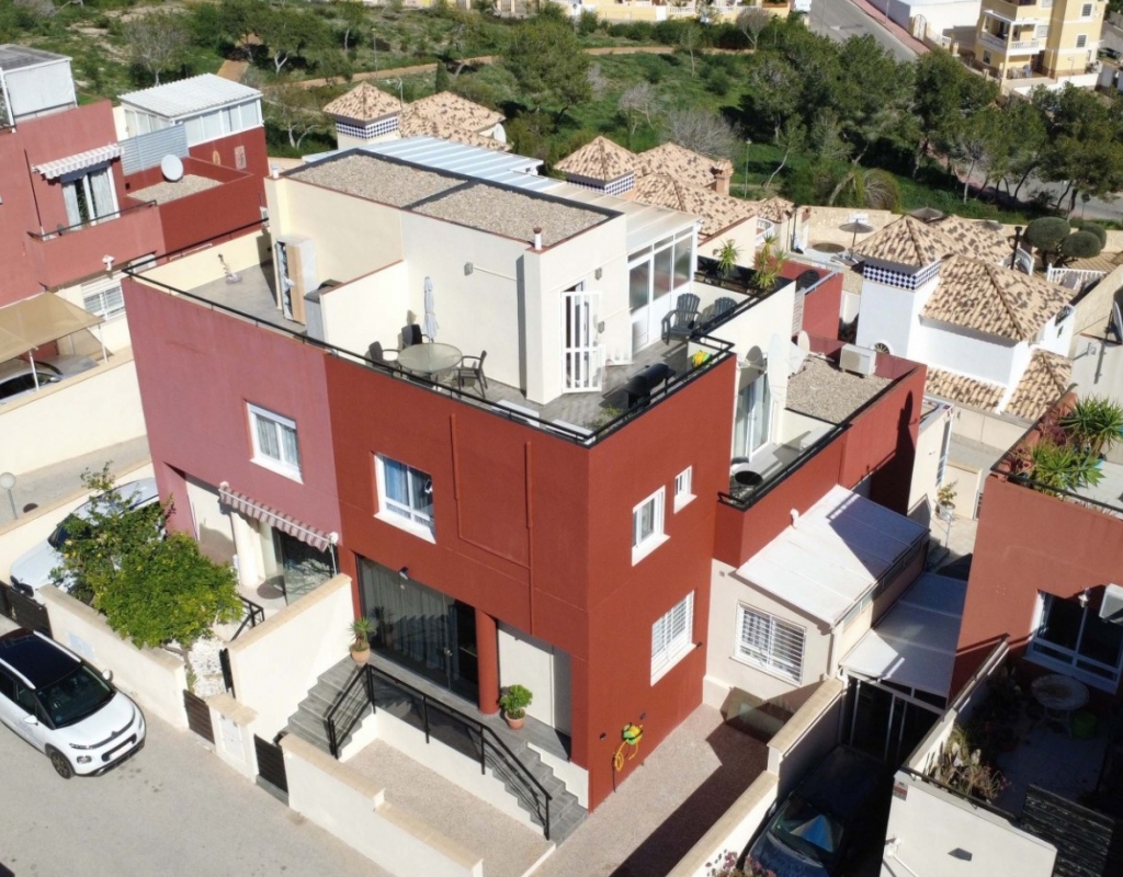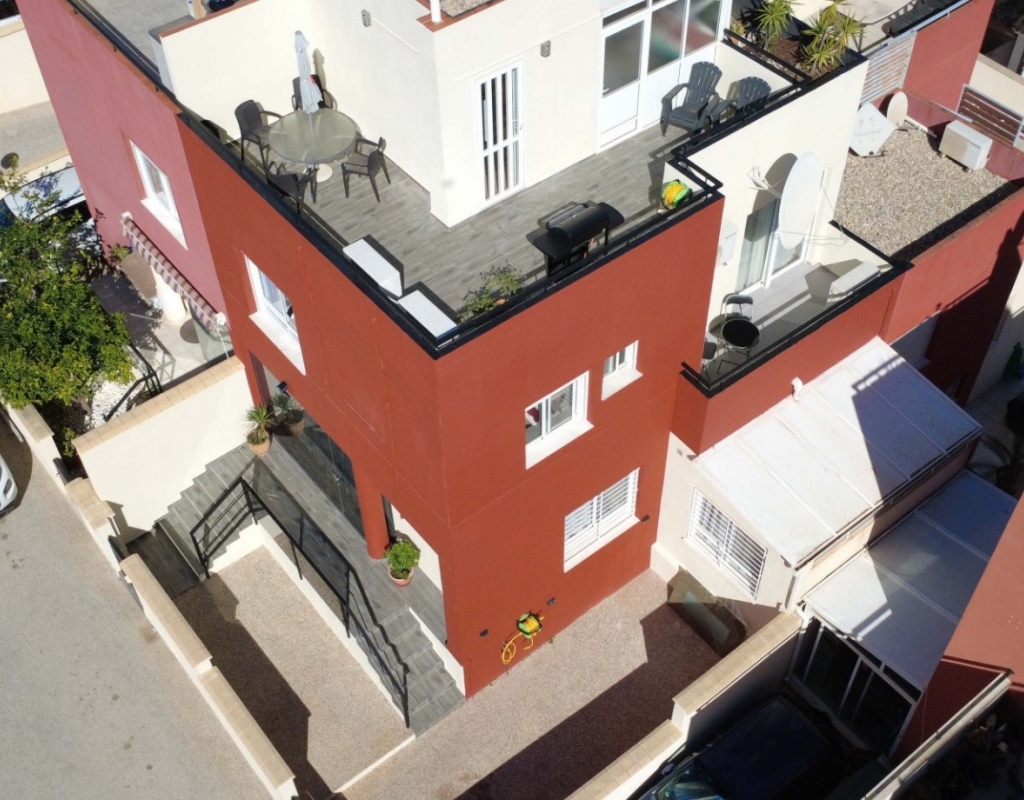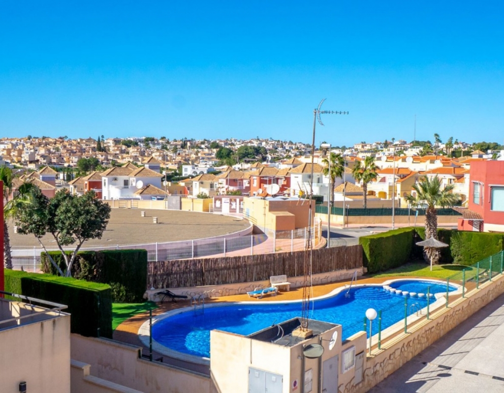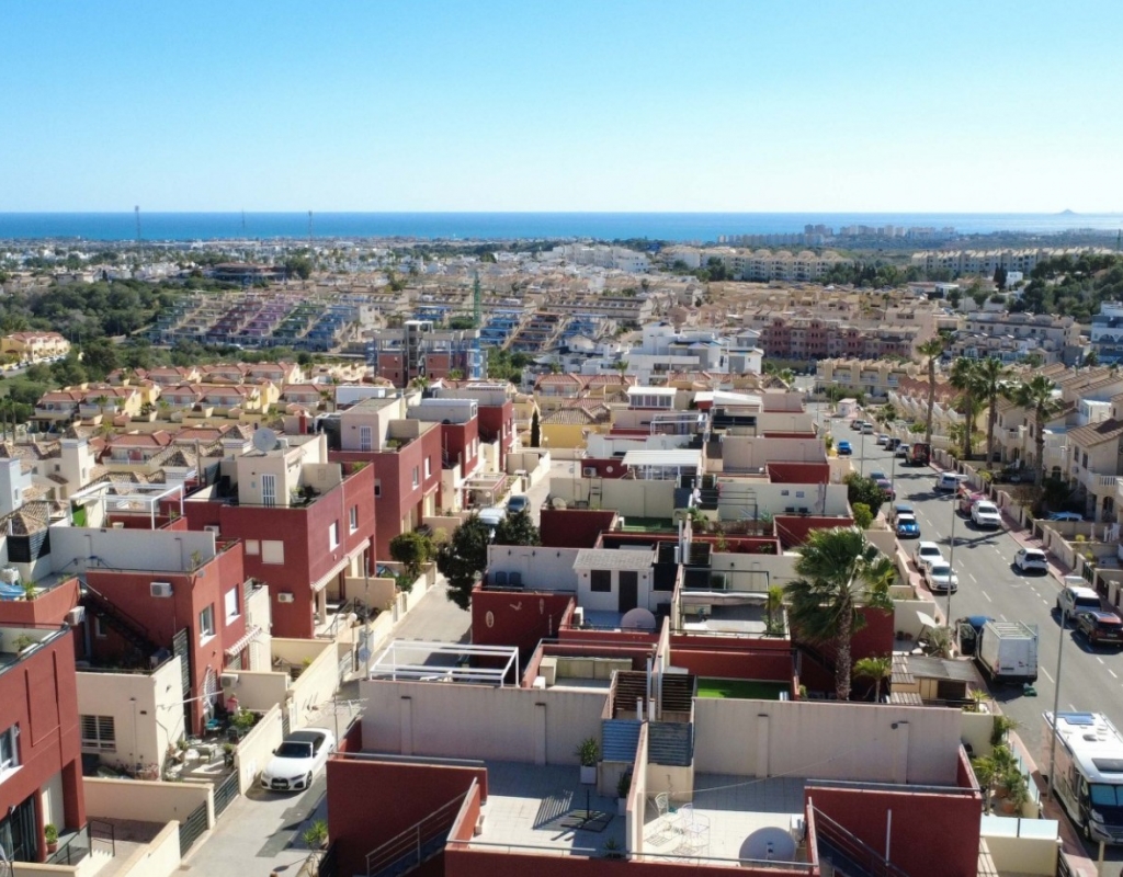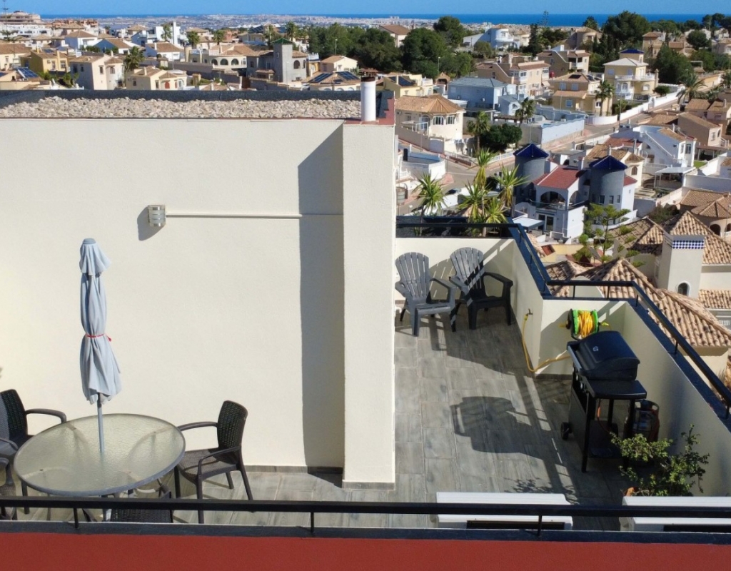 Welcome to this charming 3-bedroom, 2-bathroom townhouse located in the highly sought-after area of Villamartín, on the beautiful Costa Blanca. This property offers a perfect combination of comfort, outdoor living, and stunning views — ideal as a permanent residence, holiday home, or investment property. On the ground floor, you’ll find a bright and welcoming living area with dining space, a fully equipped kitchen, one bathroom, and direct access to a spacious private terrace — perfect for outdoor dining, relaxing, or enjoying the Mediterranean climate all year round. Upstairs features three well-proportioned bedrooms and an additional bathroom. From here, you have access to a private balcony, while the highlight of the home is the impressive roof terrace (solarium) offering spectacular sea views — the perfect place to unwind, sunbathe, or entertain guests. The property is partly renovated, giving it a fresh and modern touch while still offering potential to personalise further. It is sold fully furnished, making it completely ready to move into or rent out immediately. Residents also benefit from access to a beautiful communal pool area, ideal for cooling off during the warm Spanish summers. Located close to golf courses, restaurants, shops, and just a short drive to the beaches of Orihuela Costa, this townhouse offers excellent value in one of the most popular areas on the Costa Blanca. A fantastic opportunity in Villamartín — viewings highly recommended.