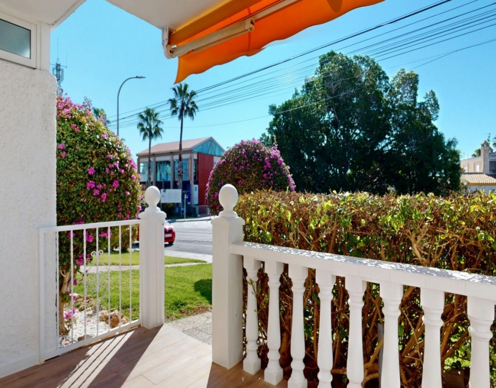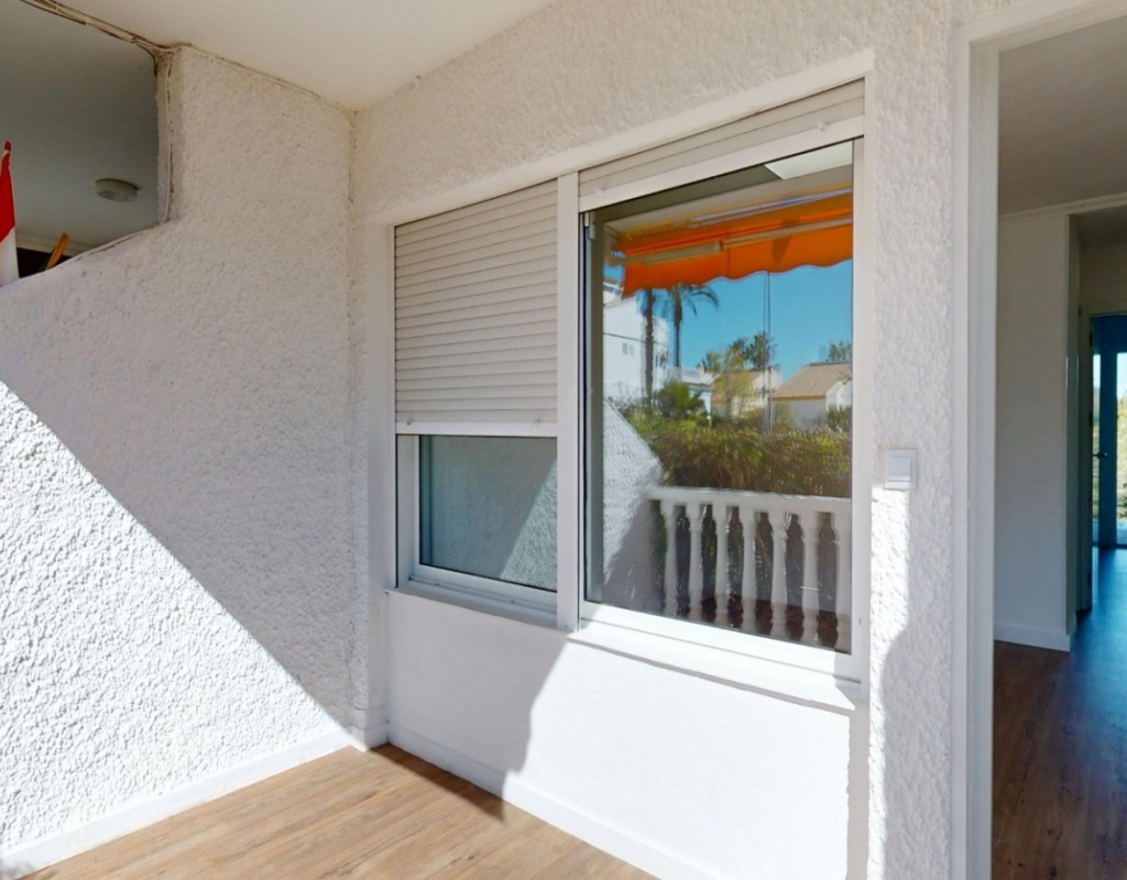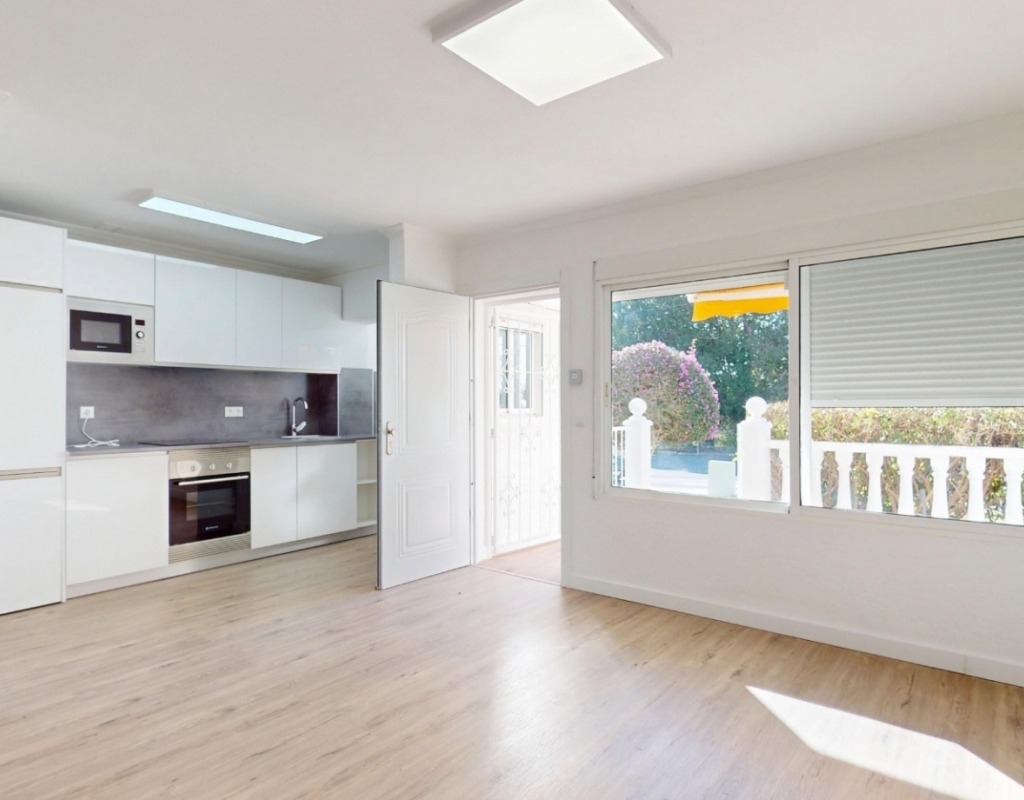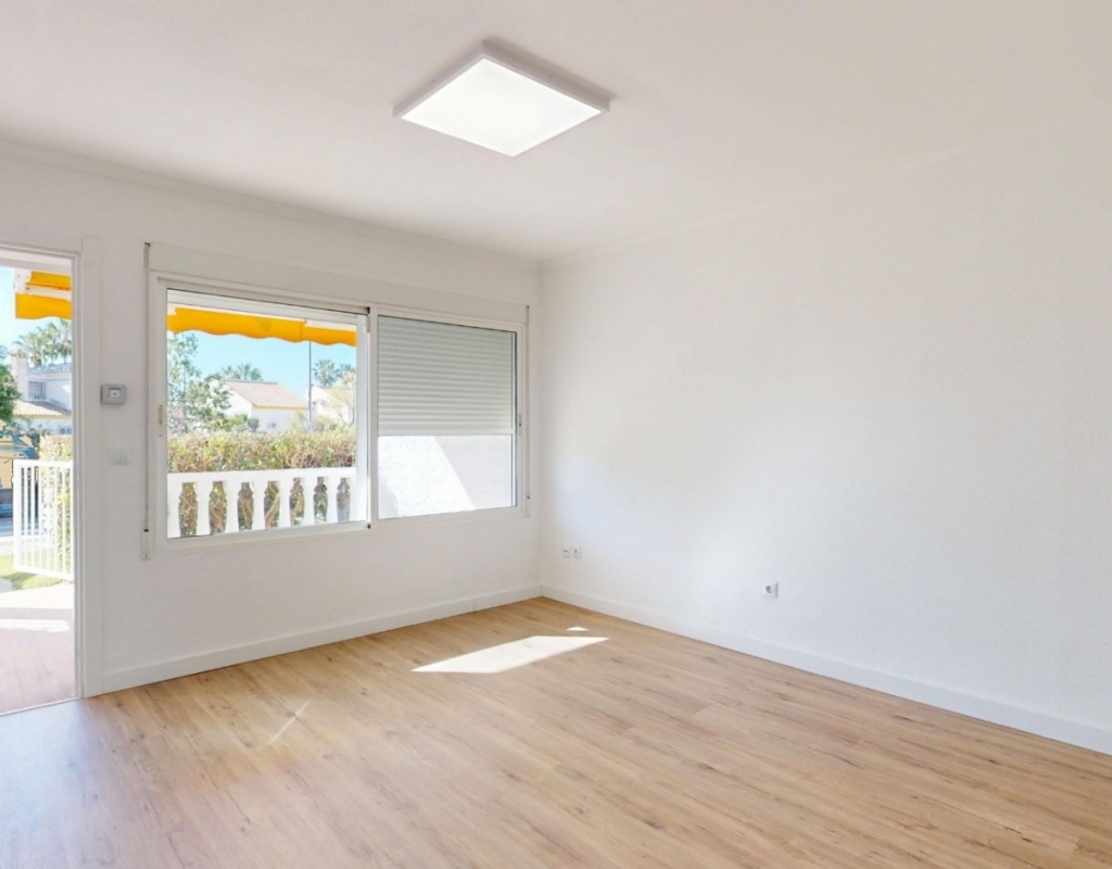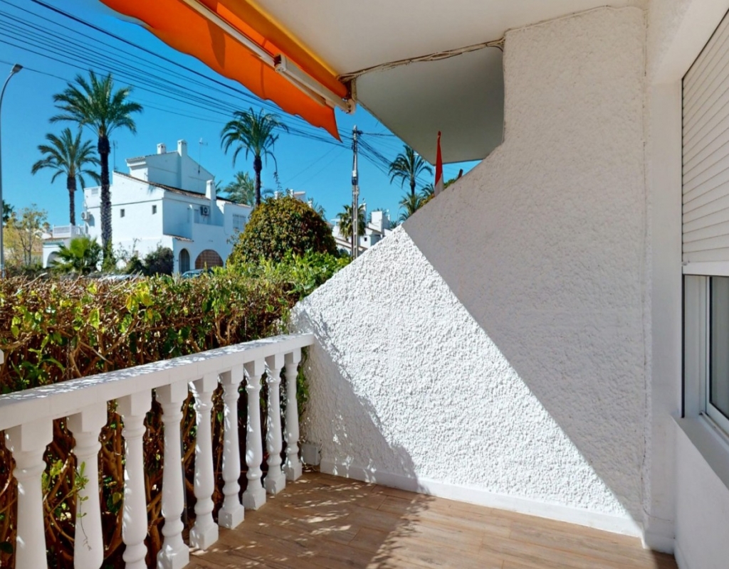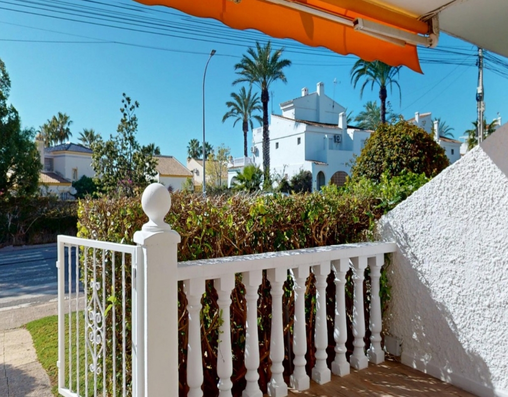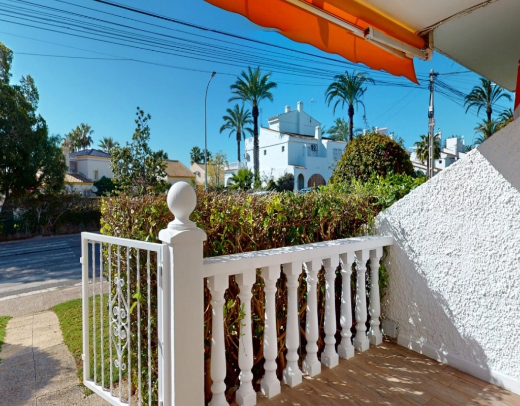 Located in the well-established area of Villamartín, this beautifully renovated ground floor apartment offers a perfect combination of modern design, comfort, and outdoor living, making it an excellent property for sale in Villamartín Orihuela Costa. The property has been fully refurbished, featuring new flooring, updated installations (electricity and plumbing), and a stylish, move-in-ready finish throughout. Inside, the home offers two spacious bedrooms with fitted wardrobes, a modern bathroom with walk-in shower, and a brand-new fully equipped kitchen with appliances including washing machine and dishwasher. The bright living area connects seamlessly to the outdoor spaces, creating a comfortable and functional layout. One of the standout features of this property is its exceptional outdoor space. At the front, you will find a private covered porch with awning, perfect for relaxing in the shade, while at the rear there is a large private terrace, ideal for outdoor dining, entertaining, or enjoying the Mediterranean lifestyle all year round. The property also includes a practical exterior storage cupboard. The apartment is set within a well-maintained residential community surrounded by lush communal gardens, creating a peaceful and green environment. The location is highly convenient, within walking distance to La Rioja commercial centre, Dialprix supermarket, restaurants, and local amenities, and just minutes by car to Villamartín Plaza, Zenia Boulevard, golf courses, and the beaches of Orihuela Costa. This is an ideal home near golf courses and the beaches of Orihuela Costa, and a perfect holiday home or investment property in Costa Blanca South.