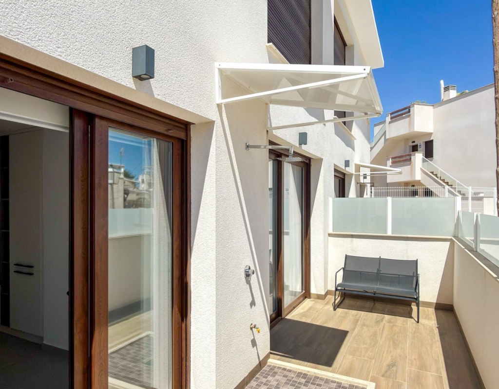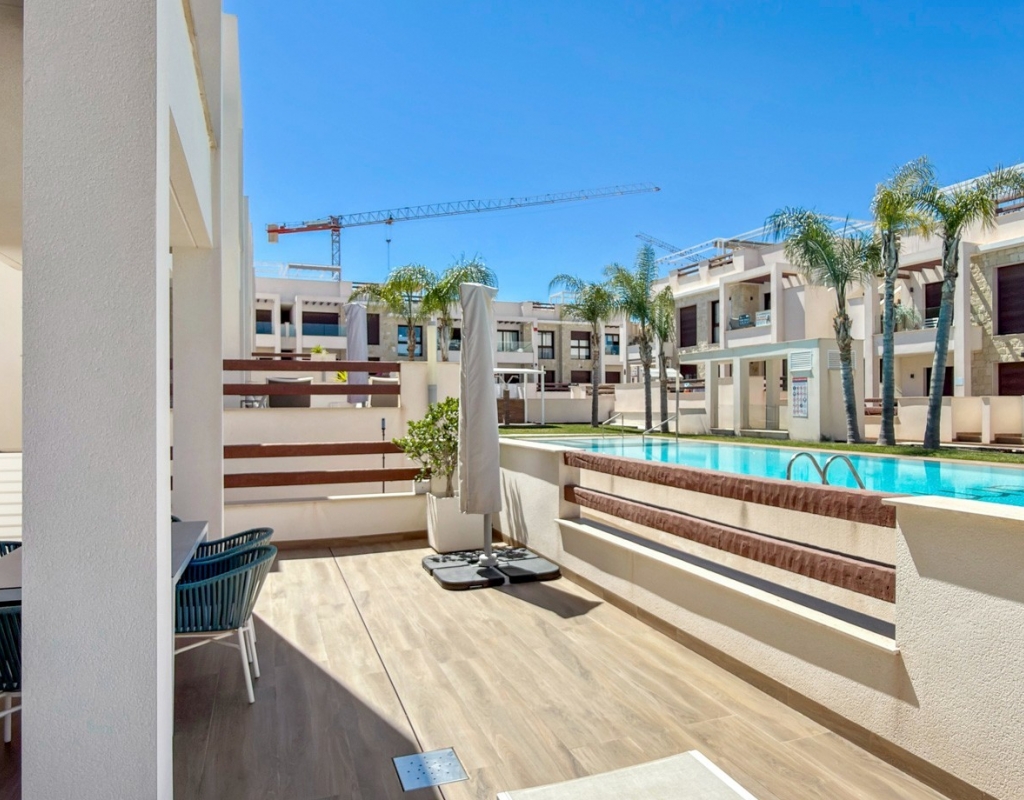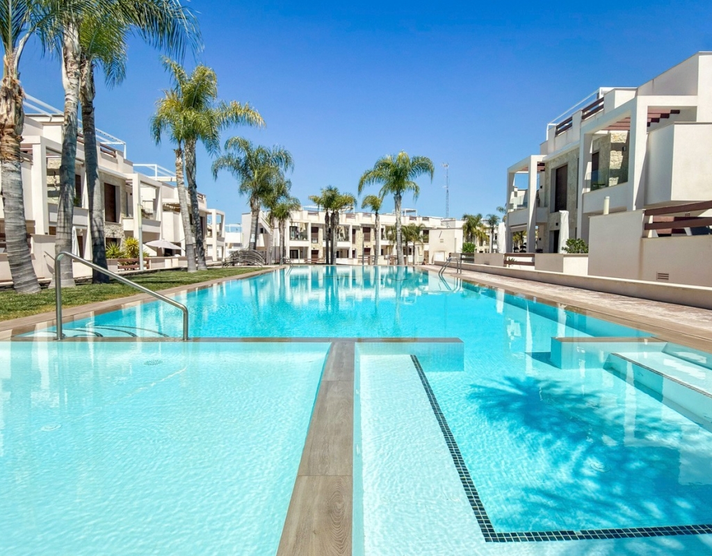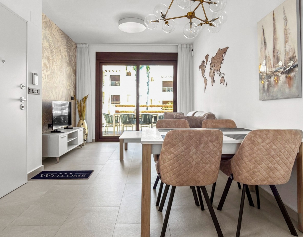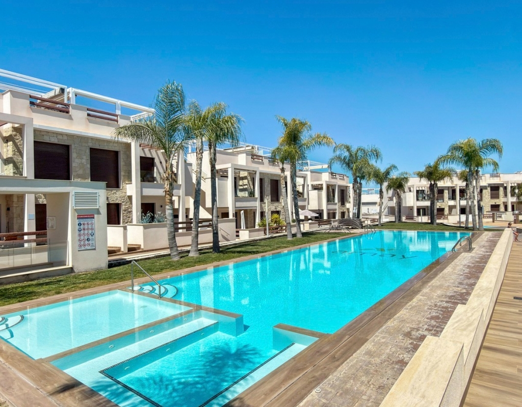 Discover this key-ready 2-bedroom ground floor apartment in Los Balcones, perfectly positioned with direct access to beautiful gardens and two semi-Olympic pools. This bright, modern home offers spacious open-plan living, 2 stylish bathrooms with underfloor heating, and fully furnished interiors with high-end finishes throughout. Enjoy sun all day with two private terraces – a southwest-facing front terrace leading straight to the pool, and a peaceful southeast rear terrace for morning coffee. Built as the show home by Amay, the property includes premium upgrades such as a designer Italian kitchen, powerful air conditioning, electric shutters, alarm system, and private underground parking with storage. Located just minutes from beaches, golf courses, and La Zenia Boulevard, this is the perfect holiday home, investment, or permanent residence on the Costa Blanca. Ready to move in – just bring your suitcase.