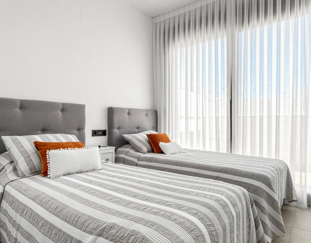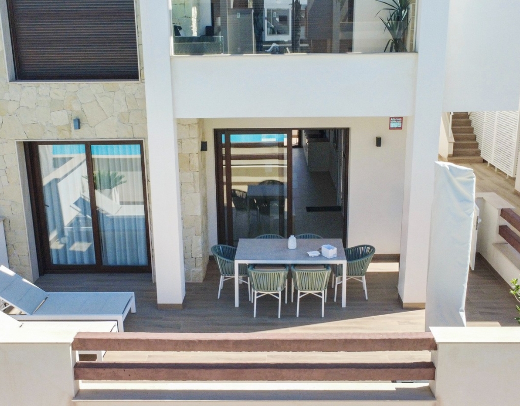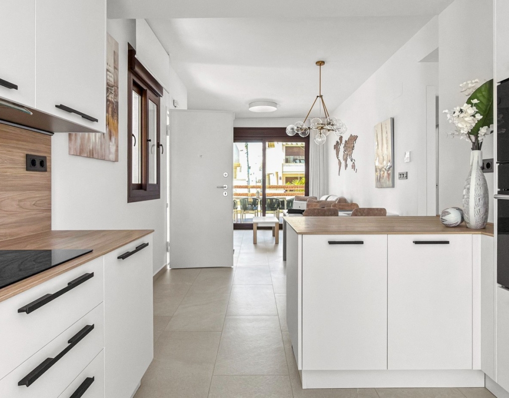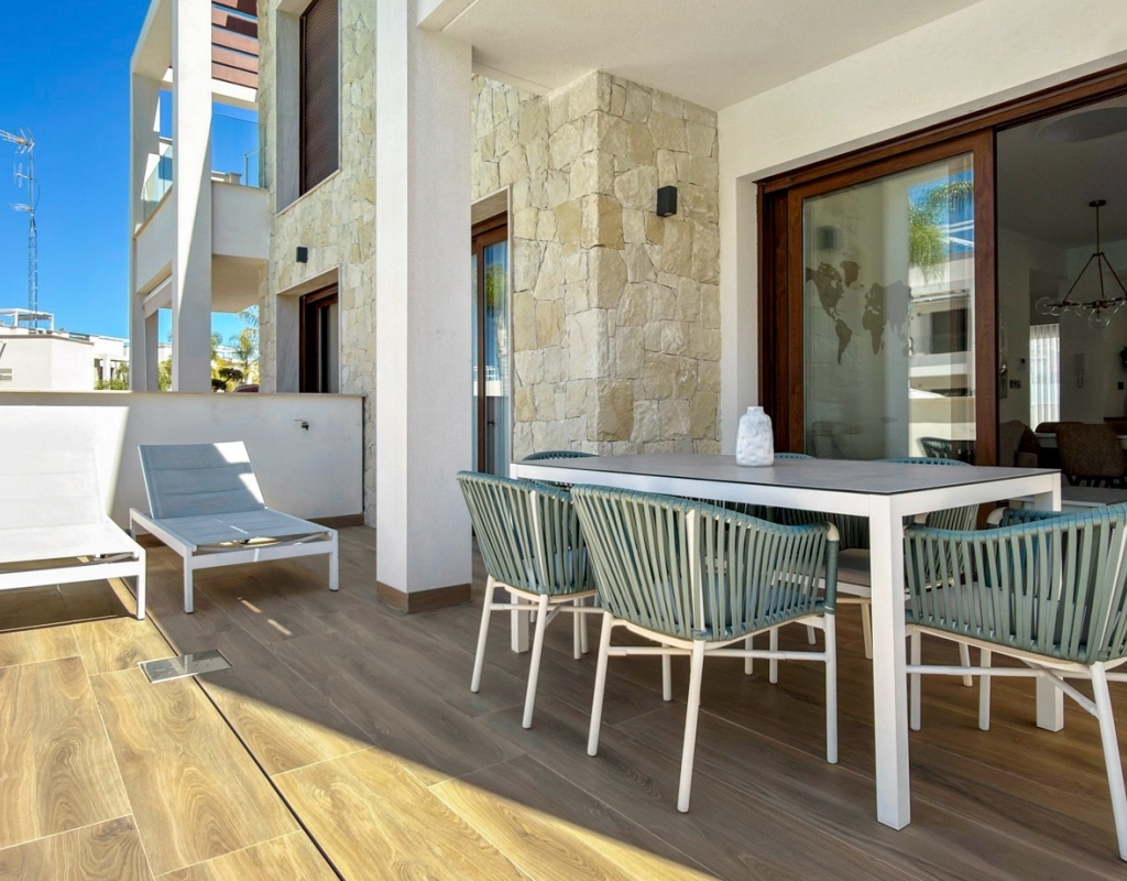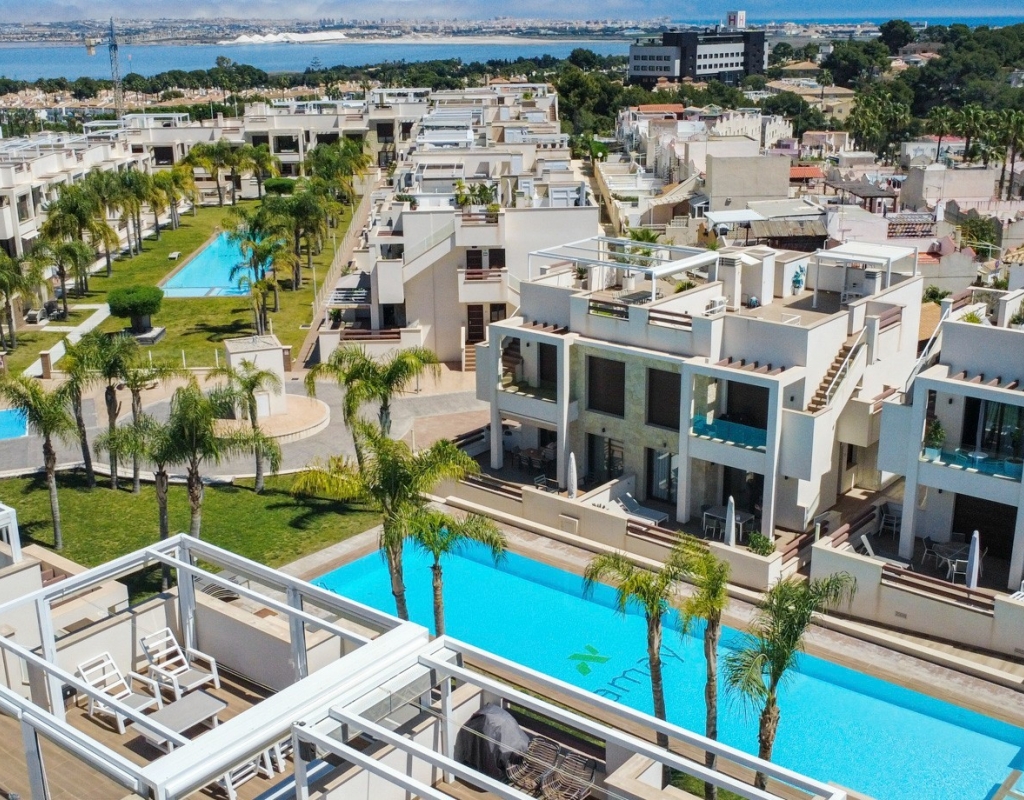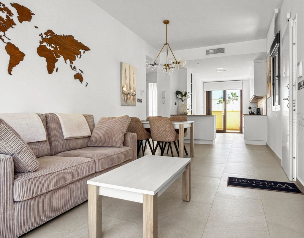 Discover this key-ready 2-bedroom ground floor apartment in Los Balcones, perfectly positioned with direct access to beautiful gardens and two semi-Olympic pools. This bright, modern home offers spacious open-plan living, 2 stylish bathrooms with underfloor heating, and fully furnished interiors with high-end finishes throughout. Enjoy sun all day with two private terraces – a southwest-facing front terrace leading straight to the pool, and a peaceful southeast rear terrace for morning coffee. Built as the show home by Amay, the property includes premium upgrades such as a designer Italian kitchen, powerful air conditioning, electric shutters, alarm system, and private underground parking with storage. Located just minutes from beaches, golf courses, and La Zenia Boulevard, this is the perfect holiday home, investment, or permanent residence on the Costa Blanca. Ready to move in – just bring your suitcase.